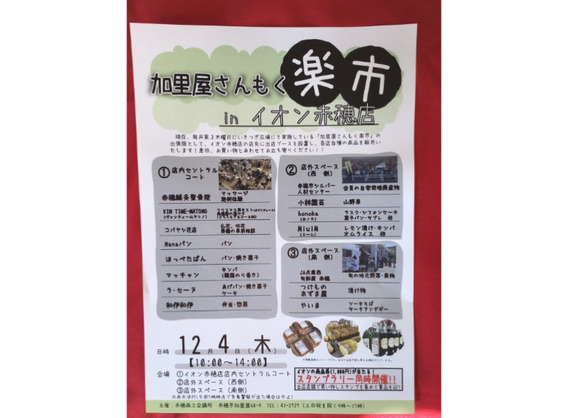 毎月第3木曜にいきつぎ広場にて実施されている加里屋さんもく楽市(赤穂商工会議所主催)の出張版「加里屋さんもく楽市 in イオン赤穂店」が、昨年に引き続き開催されます。