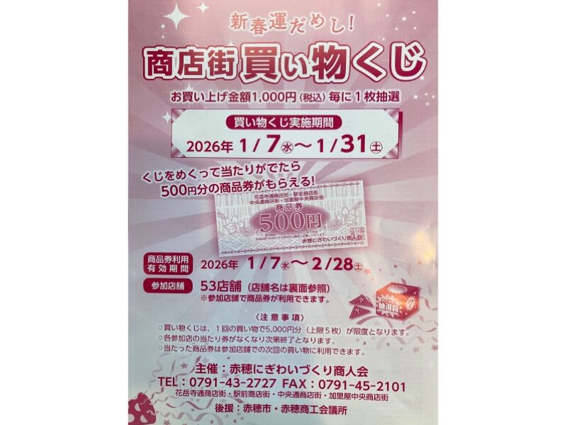 新春運だめし!商店街買い物くじに参加します!ぜひこの機会にご来店ください 買い物くじ実施期間:2026年1月7日~31日 お買い上げ金額1,000円(税込)毎に一枚抽選。くじをめくって当たりがでたら500円分の商品券がもらえる!チャンスです。※買い物くじは、1回の買い物で5000円分(上限5枚)が限度となります。※当たり券が無くなり次第終了となります。※あたった商品券は、参加店舗での次回買い物に利用できます。 商品券利用有効期間:1月7日~2月28日 主催:赤穂にぎわいづくり商人会 後援:赤穂市・赤穂商工会議所 Tweet Share 年末のごあいさつ 前の記事 新年のごあいさつ 次の記事