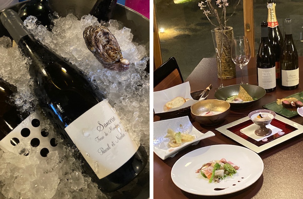 冷菜は「春野菜と海鮮のパッチョ仕立て」と、爽やかな味わいの白『サンセール』の組み合わせ。透明感のあるワインと春の香りいっぱいのマリアージュは、「とても飲みやすくて、とっても合うねー。おいしい!」と喜びの声を多くいただきました。